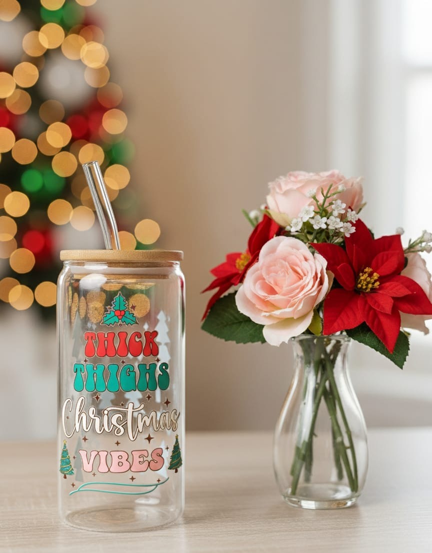 Glazen beker met een houten deksel. De tumbler heeft een bedrukking in kerst thema met de zin THICK THIGHS , CHRISTMAS VIBES. Wordt geleverd met een glazen rietje.