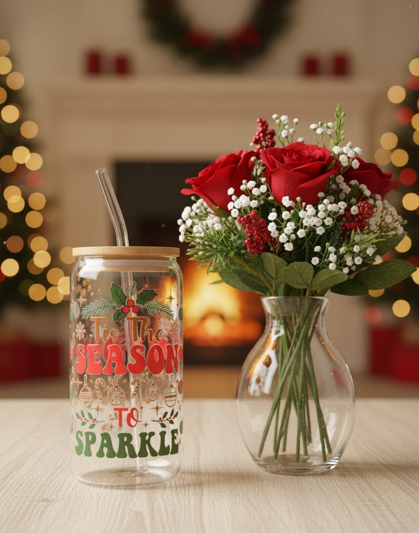 Glazen beker met een houten deksel. De tumbler heeft een bedrukking in kerst thema met de zin TIS THE SEASON TO SPARKLE. Wordt geleverd met een glazen rietje.