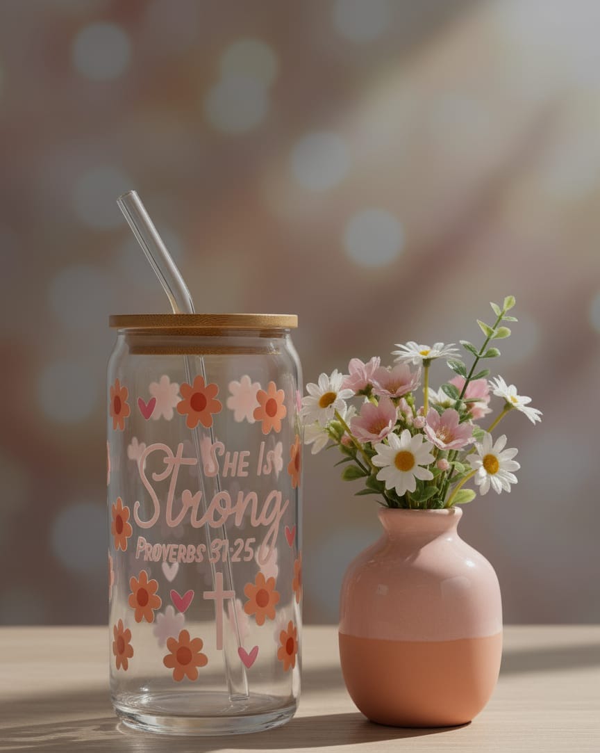Glazen beker met een houten deksel. De tumbler is bedrukt met de zin SHE IS STRONG, en een bijbel vers . Wordt geleverd met een glazen rietje.