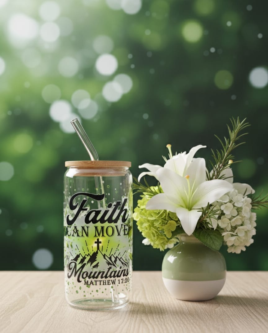 Glazen beker met een houten deksel. De tumbler is bedrukt met de zin FAITH CAN MOVE MOUNTAINS met op de achtergrond een afbeelding van een berg. Wordt geleverd met een glazen rietje.
