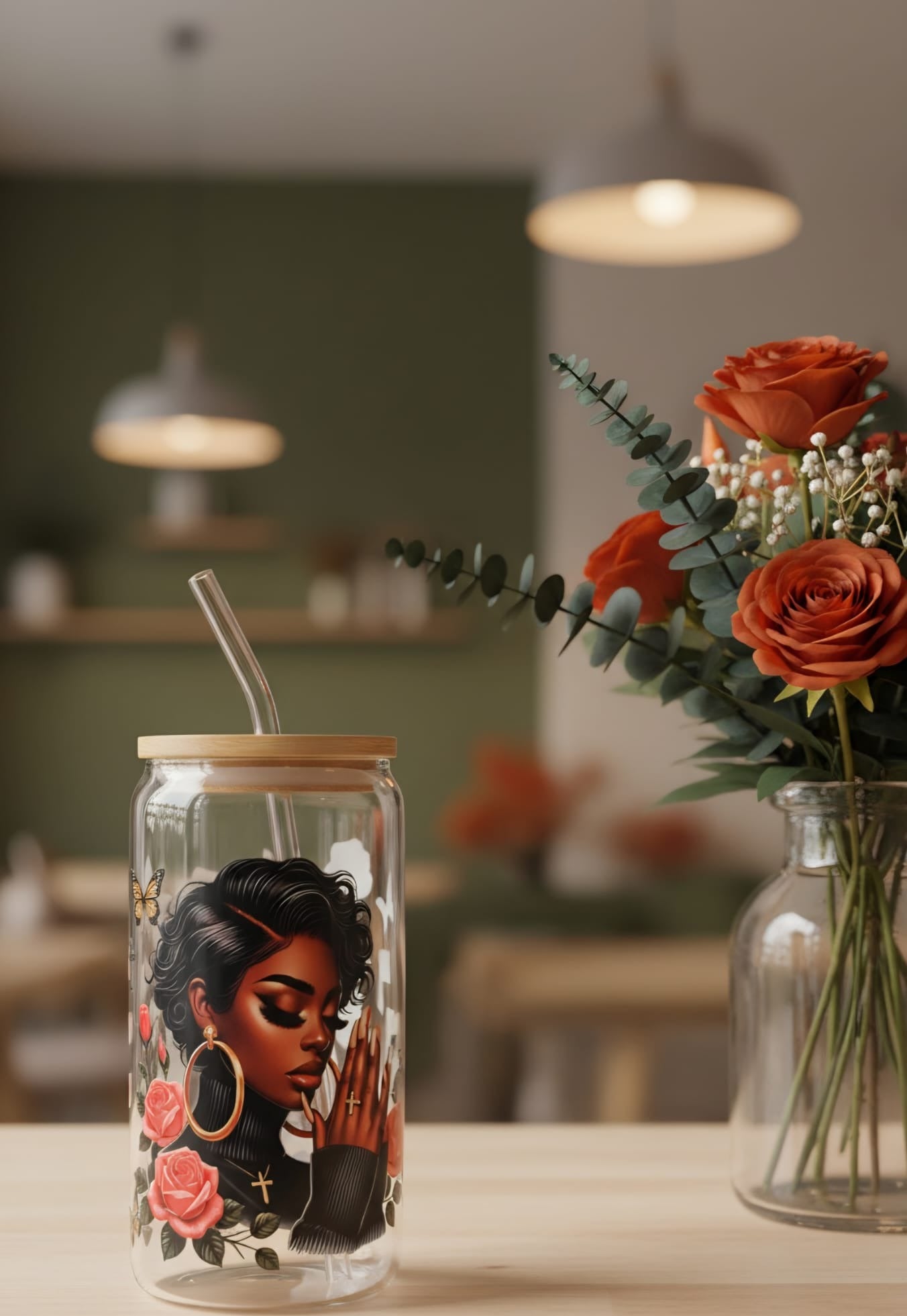 Glazen beker met een houten deksel. De tumbler heeft een afbeelding van een vrouw die aan het bidden is . Wordt geleverd met een glazen rietje.